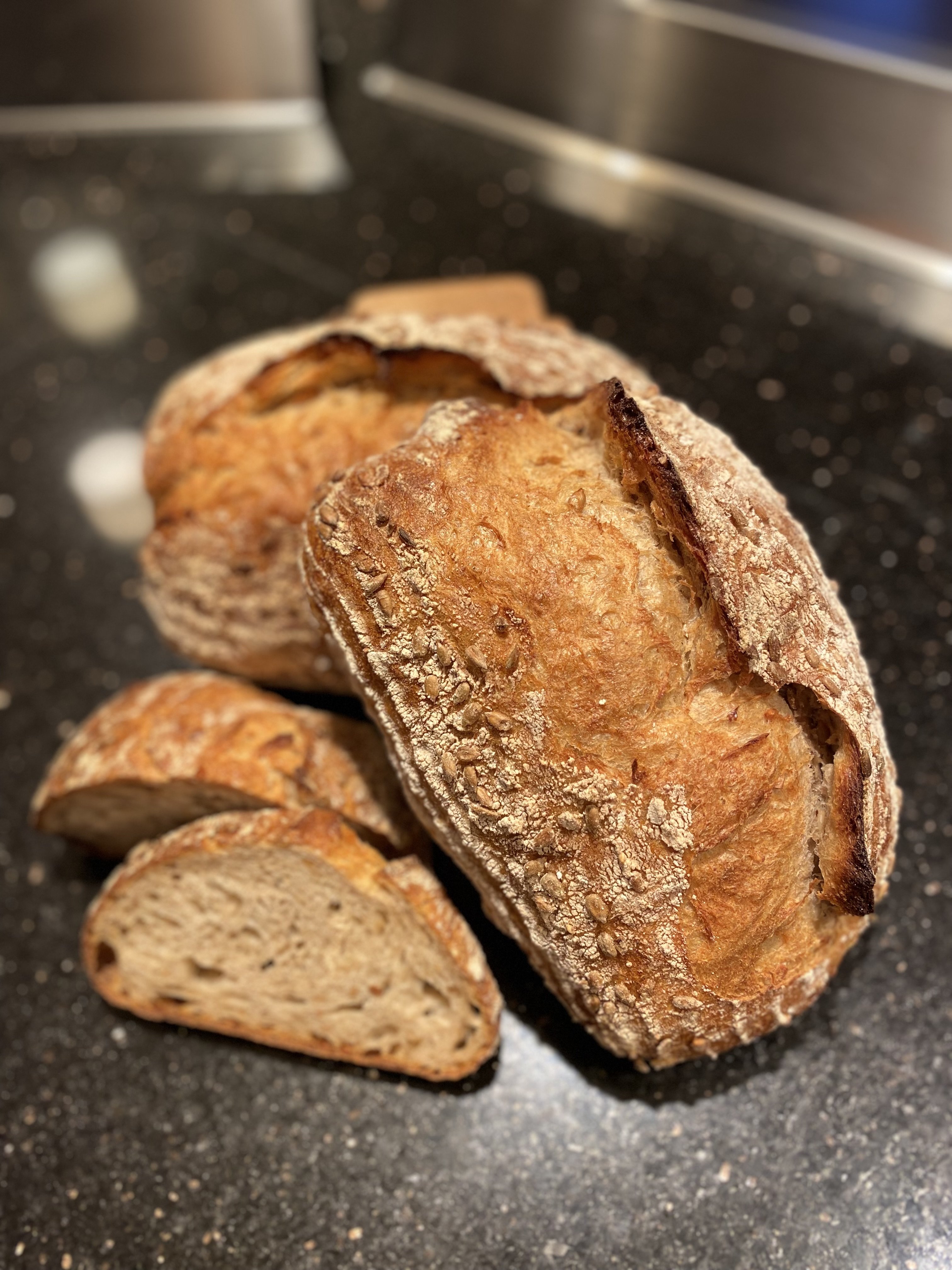 40% Weizenmehl, 40% Dinkelmehl, 20% Waldstaudenroggen (Ur- Roggen), belebtes Wasser, geröstete Sonnenblumenkerne, Salz, Hefe.